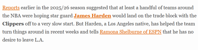 北京时间1月17日,2025-26赛季初期曾有报道称,由于快船队开局战绩惨淡,联盟中至少有几支球队都盼着当家后卫哈登能被摆上交易货架。但身为洛杉矶本地人的哈登,在过去几周助力球队扭转颓势,他在接受ESPN采访时明确表示,自己毫无离开洛杉矶的念头。